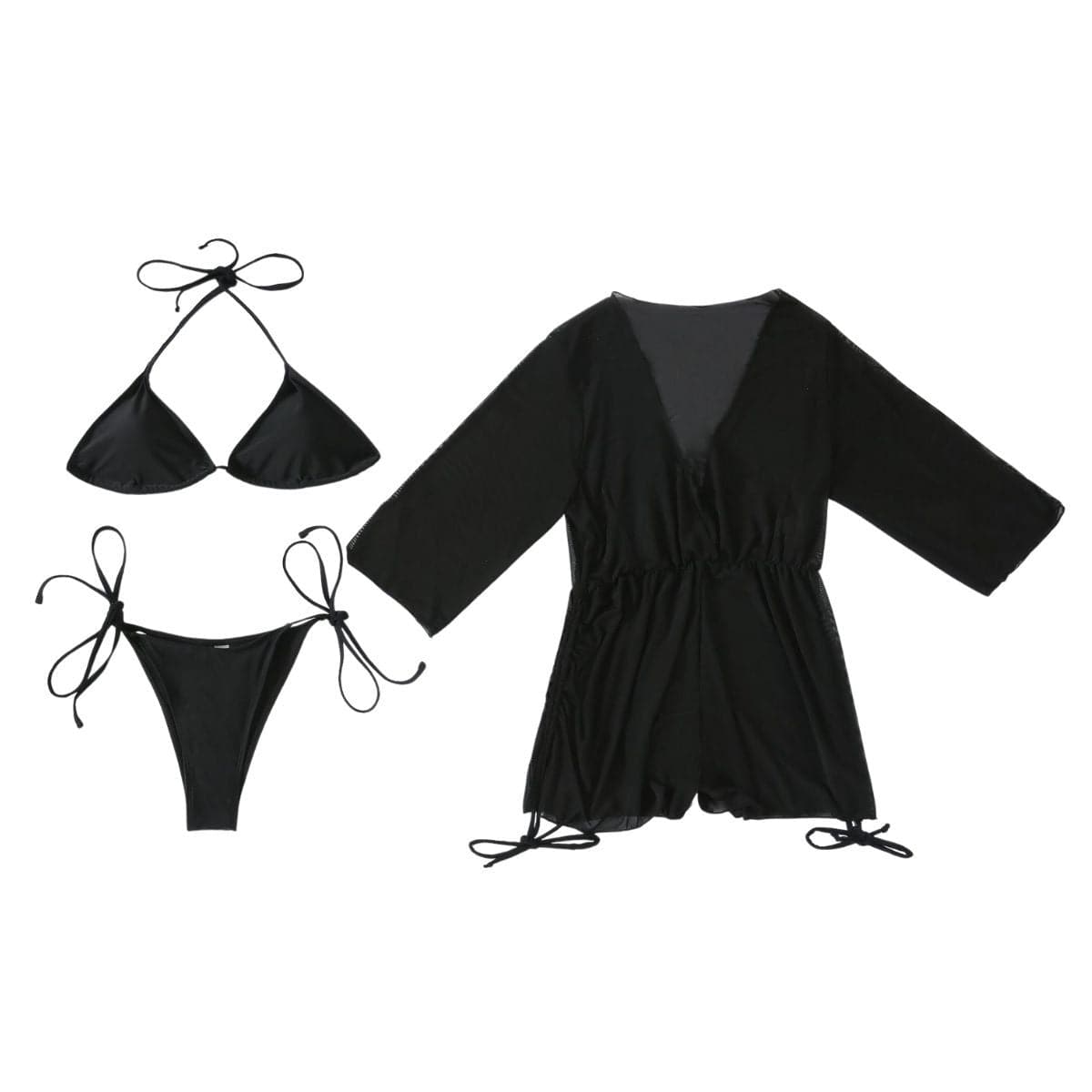 Solid halter self tie mesh long sleeve 3 piece swimwear