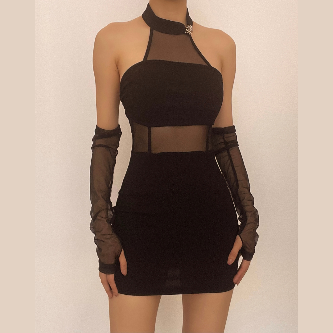 Solid mesh gloves button halter backless mini dress