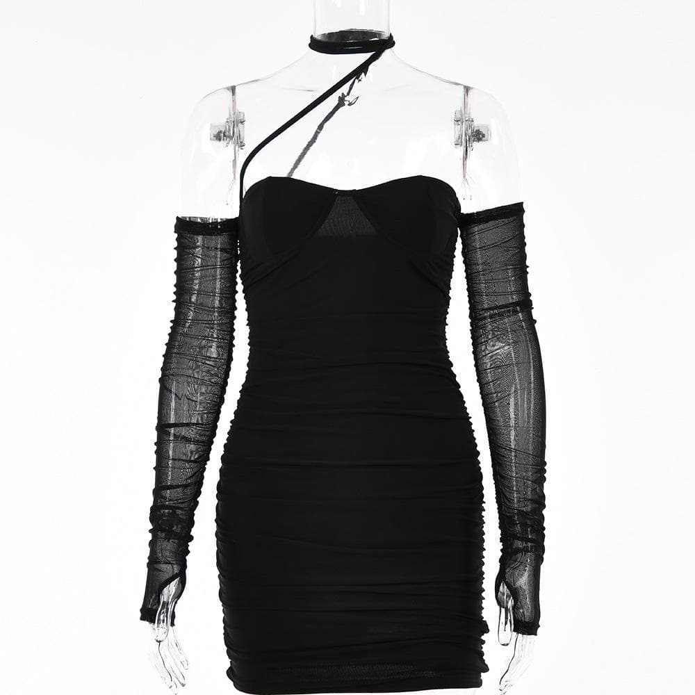 Solid ruched halter mesh long sleeve off shoulder mini dress
