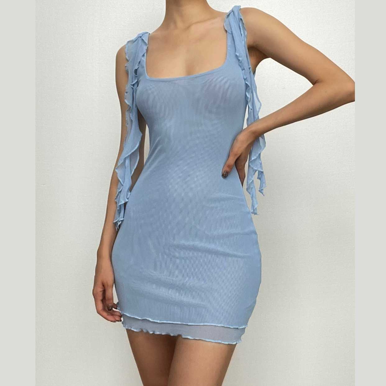 Square neck sheer mesh backless ruffle ribbon solid mini dress