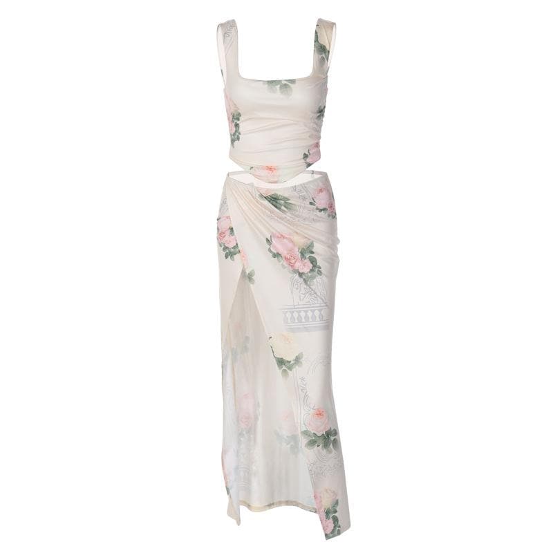 Square neck sleeveless flower print ruched slit maxi skirt set