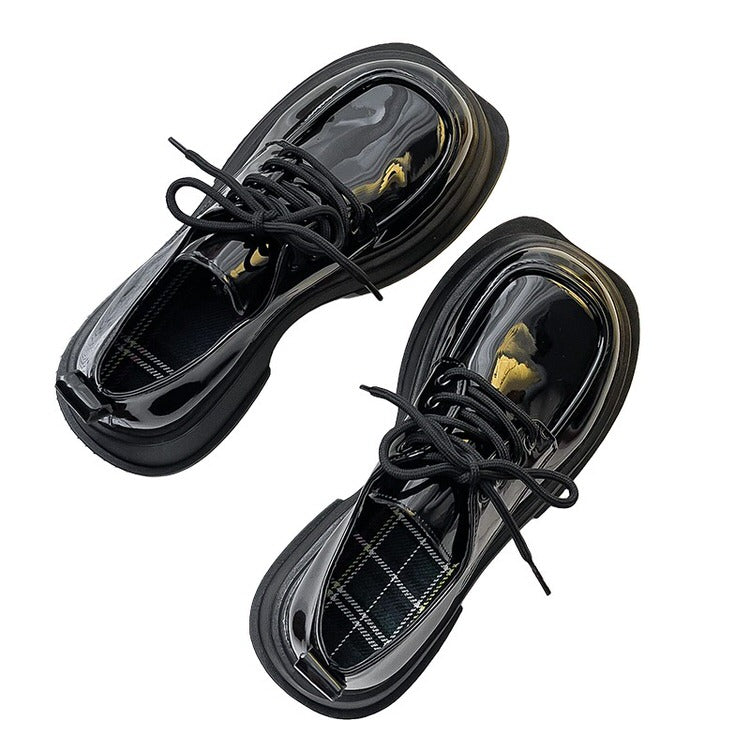 These aesthetic platform boots have a vegan leather construction. block heels. and front lace up closures