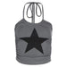This halter crop top features a bold black star print. ruched sides. and adjustable tie straps with bead accents