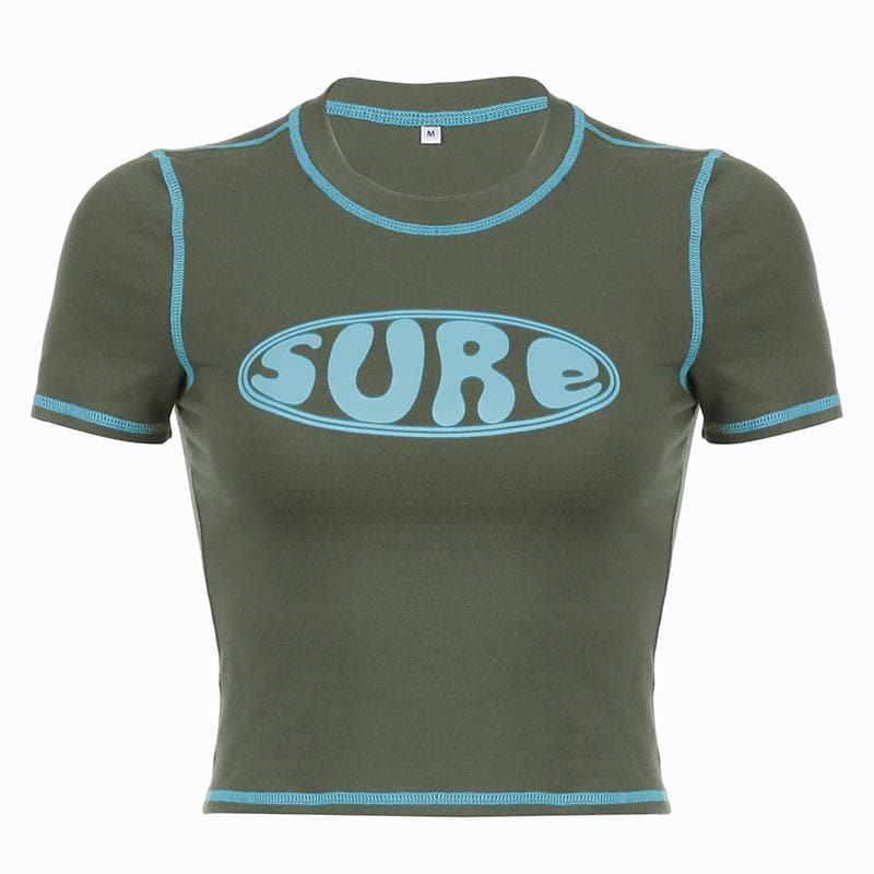 Stitch contrast short sleeve "sure" pattern crewneck crop top