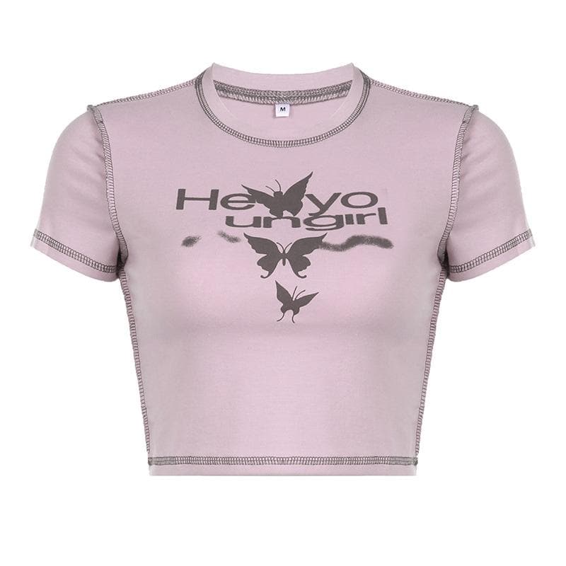 Stitch crewneck butterfly pattern contrast crop top