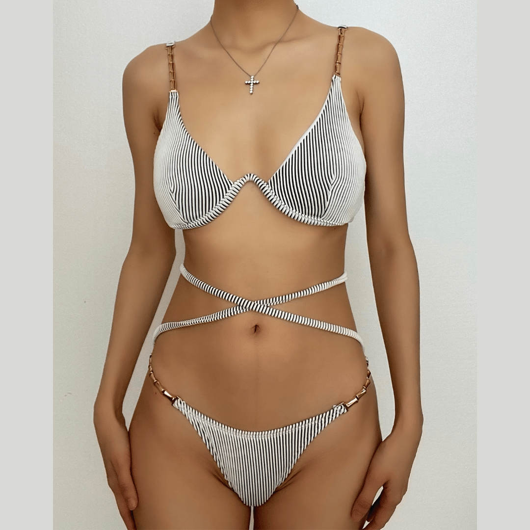 Striped metal chain cross front backless bikini swimwear