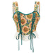 This corset top features a vibrant sunflower print. lace-up ribbons. and delicate lace trimerfect for adding vintage-inspired charm to any cottagecore or summer look