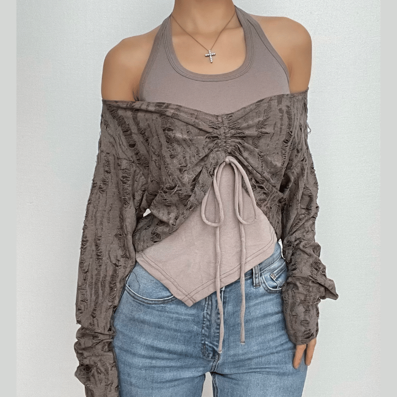 Textured drawstring halter long sleeve contrast 2 piece top