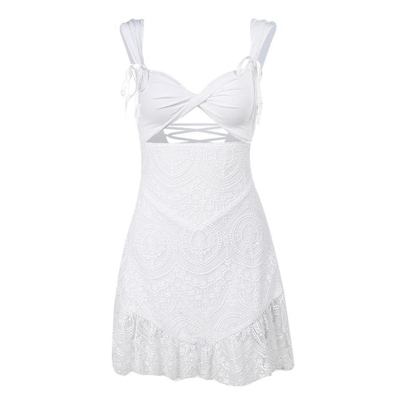 Textured knotted cap sleeve solid hollow out lace up ruffle mini dress