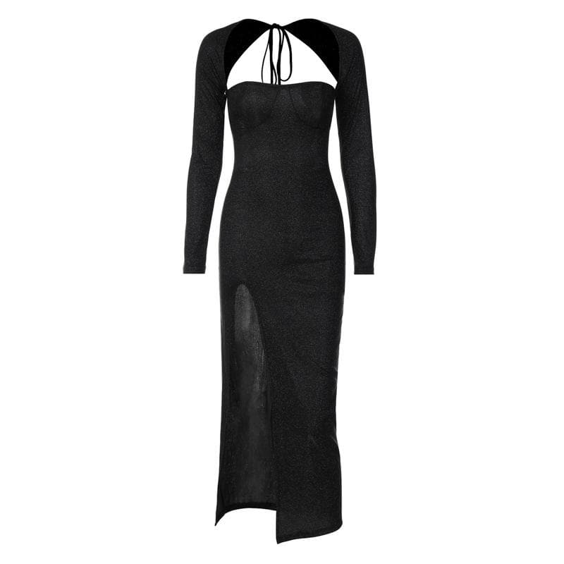 Textured long sleeve lace up self tie slit irregular ruched midi dress