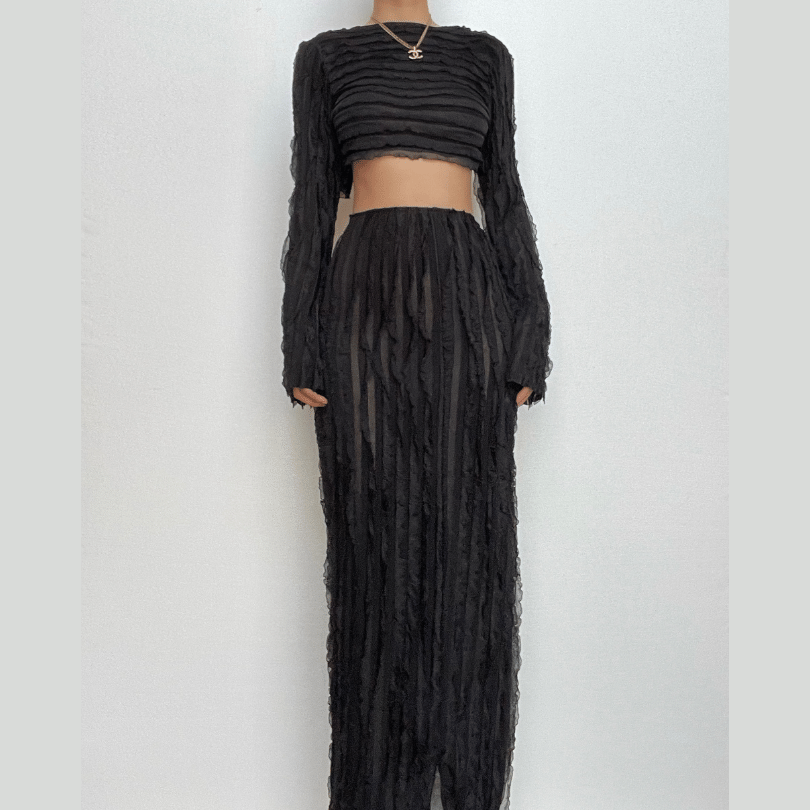 Textured self tie solid backless ruffle maxi skirt set