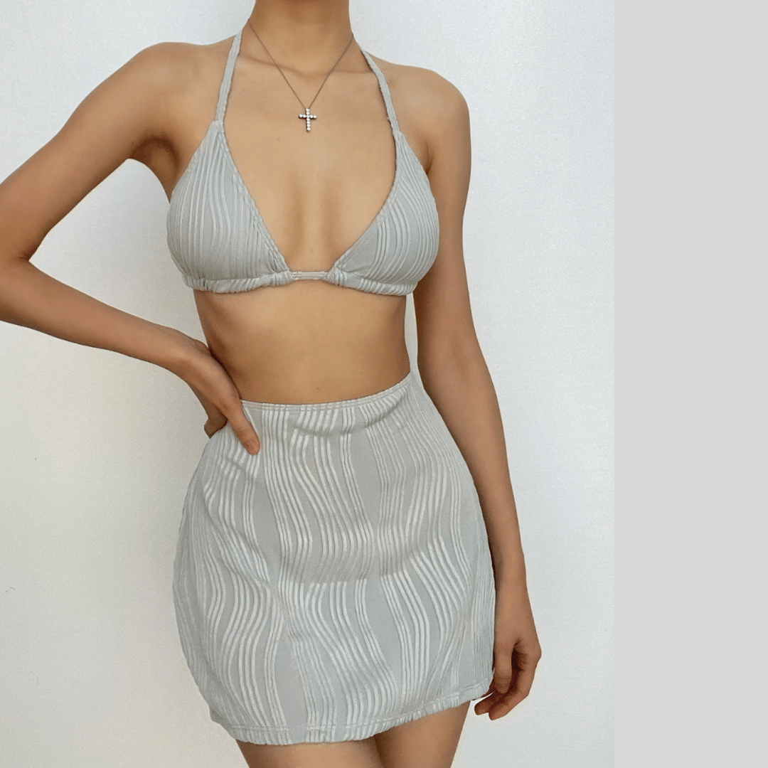 Textured solid halter self tie padded mini skirt 3 piece swimwear