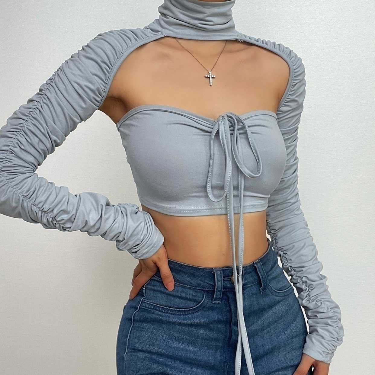 Turtle neck solid ruched long sleeve halter 2 piece crop top