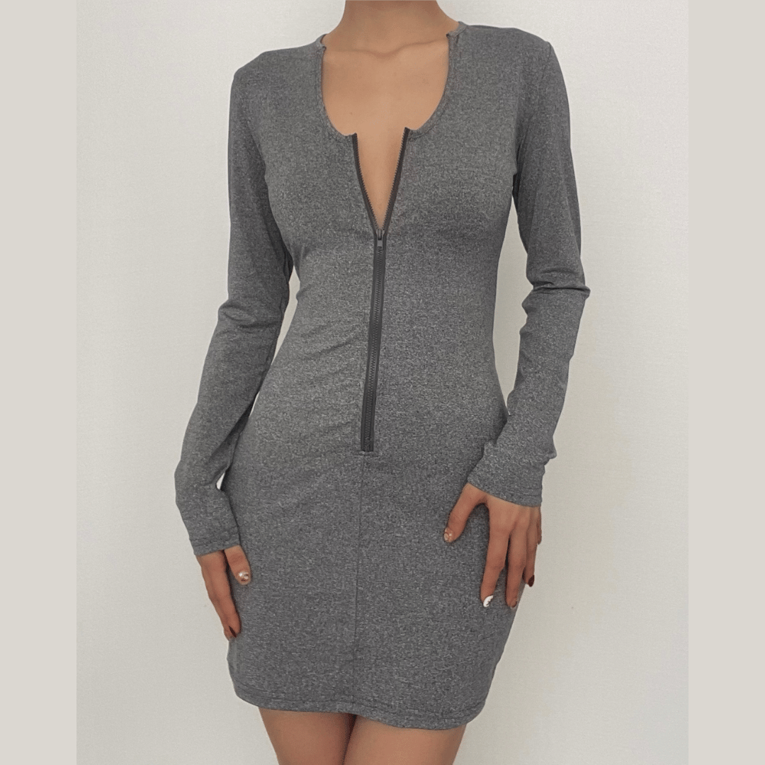 V neck low cut zip-up long sleeve solid mini dress - Final Sale