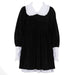This velvet mini dress has a contrast white collar . a puff sleeves. and contrast trim on the cuffs