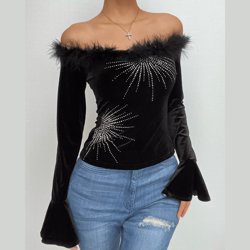 Velvet fluffy patchwork beaded off shoulder long flared sleeve top