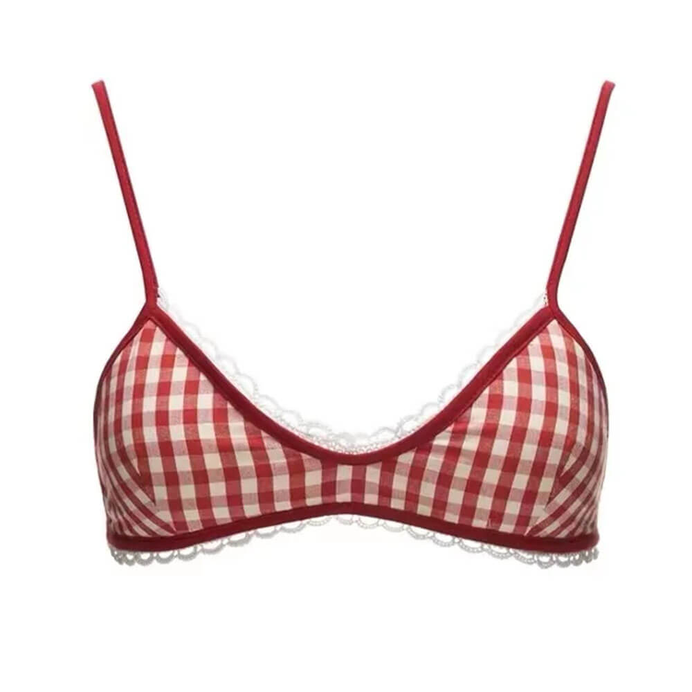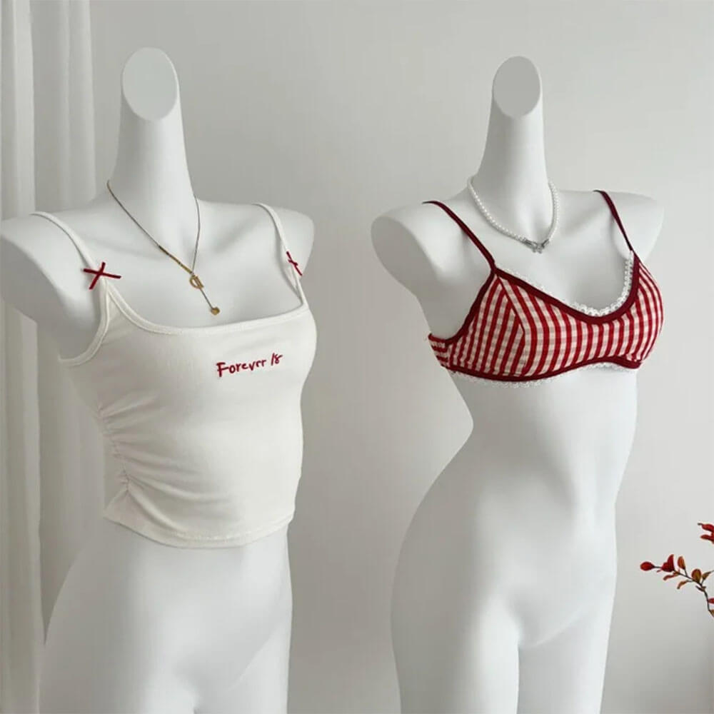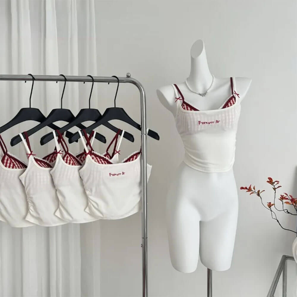 Y2K layered tank top featuring a red gingham bra design. lace trim. and "Forever 18" print on a white outer layer